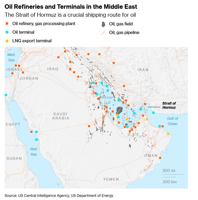 The main transmission mechanism to the world economy is via oil. Brent rallied as much as 13% to above $82 a barrel — the highest since January 2025 — before paring some gains in Asian trading on Monday.
